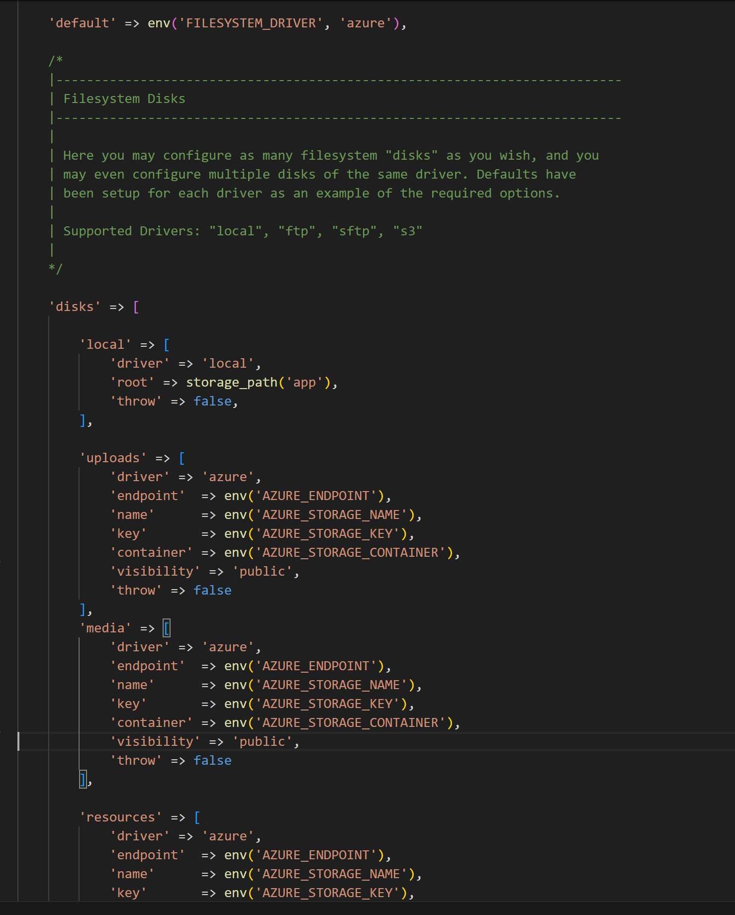I wanted to switch to Azure Storage, so I set up the environment variables: AZURE_STORAGE_NAME, AZURE_STORAGE_KEY, AZURE_STORAGE_ENDPOINT, AZURE_STORAGE_CONTAINER, and AZURE_ENDPOINT, and updated the filesystems.php file as shown below.