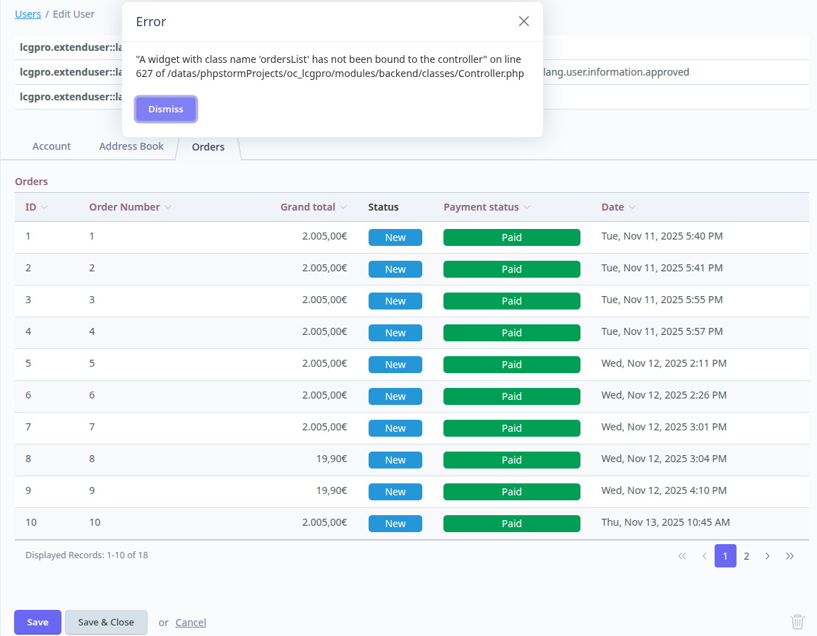 I have this code to display orders list (offline.mall) in rainlab user form, all works well except the pagination, i have this error “A widget with the class name “ordersList” has not been bound to the controller”