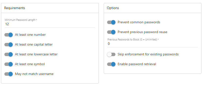 Administrators should be able to set password requirements, see image.